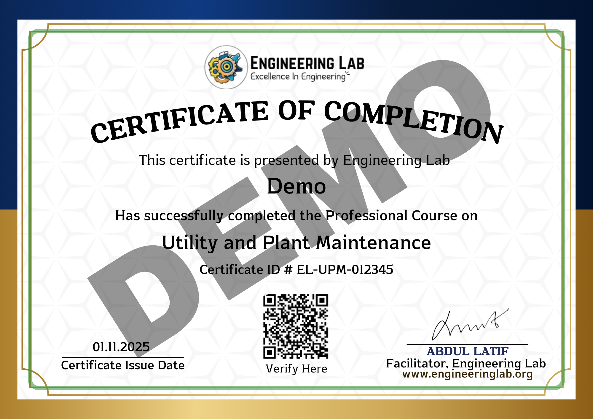 কোর্সের উদ্দেশ্য: এই কোর্সের মাধ্যমে শিল্প প্রতিষ্ঠানে ব্যবহৃত বিভিন্ন ইউটিলিটি সিস্টেম যেমন বয়লার, এয়ার কম্প্রেসার, কুলিং টাওয়ার, চিলার, ইটিপি, ডাব্লিউটিপি, সাব-স্টেশন, ট্রান্সফরমার, জেনারেটর, পাওয়ার ডিস্ট্রিবিউশন এবং ইন্ডাস্ট্রিয়াল প্ল্যান্টে ব্যবহৃত মেশিনারিজের সঠিক ইন্সটলেশন, কার্যকর অপারেশন, মেইনটেন্যান্স, Energy Efficiency and Cost Optimization সম্পর্কে পূর্ণাঙ্গ ধারণা অর্জন করবে।